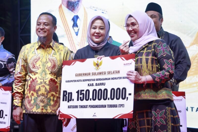 Sayap.News.Makassar– Pemerintah Kabupaten Barru kembali menorehkan prestasi membanggakan di tingkat Provinsi Sulawesi Selatan. Bupati Barru, Andi Ina Kartika Sari, S.H., M.Si., menerima penghargaan dari Gubernur Sulawesi Selatan, Andi Sudirman Sulaiman, sebagai Kabupaten/Kota Berprestasi berdasarkan Indikator Makro pada kategori Tingkat Pengangguran Terbuka (TPT).