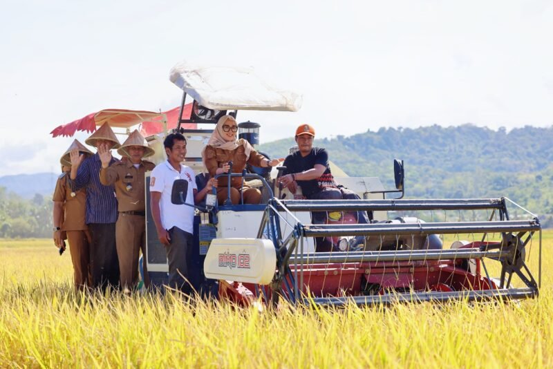 Bupati Barru, Andi Ina Kartika Sari, S.H., M.Si., hadir langsung memimpin panen dengan menggunakan mesin combine harvester. Dalam kesempatan tersebut, ia menyampaikan rasa syukur atas capaian hasil panen para petani.